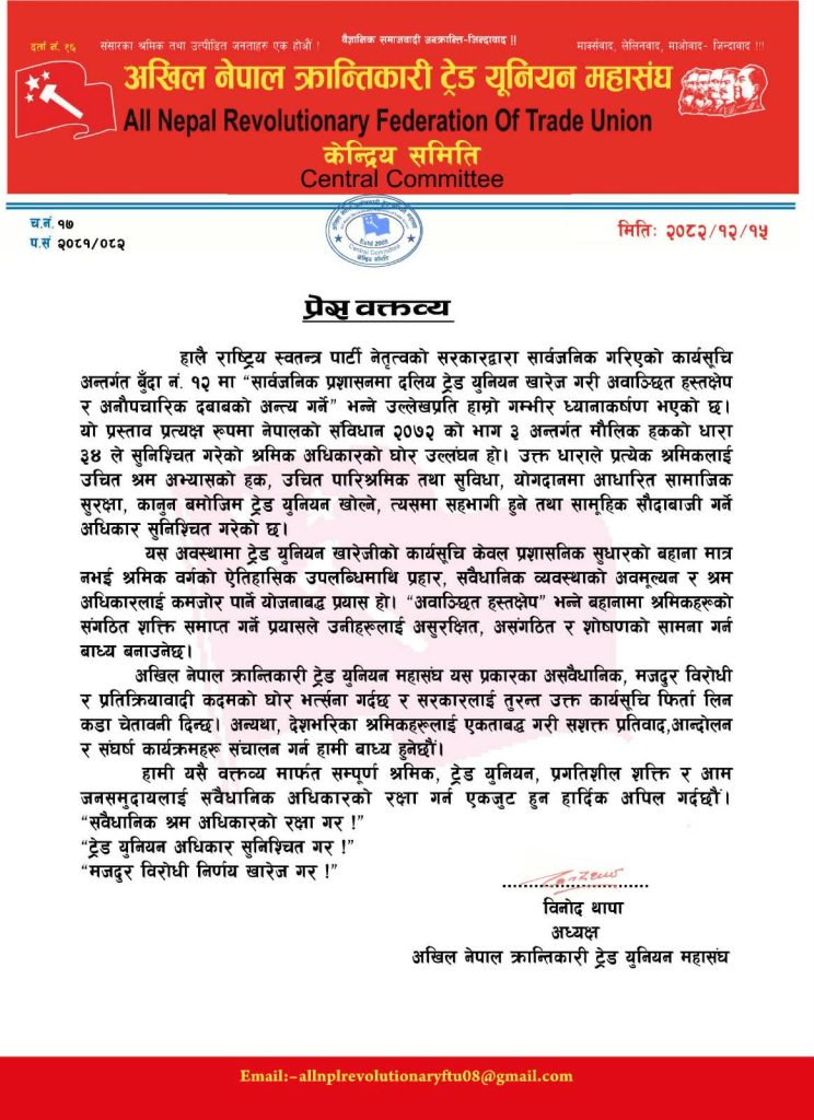 काठमाडौँ १५ चैत, अखिल नेपाल क्रान्तिकारी ट्रेड युनियन महासङ्घले सार्वजनिक प्रशासनमा दलीय ट्रेड युनियन खारेज गर्ने सरकारको प्रस्तावप्रति कडा आपत्ति जनाएको छ। महासंघले उक्त निर्णयलाई मजदुर अधिकारमाथिको प्रत्यक्ष आक्रमण भन्दै तुरुन्त फिर्ता लिन सरकारलाई चेतावनी दिएको छ।