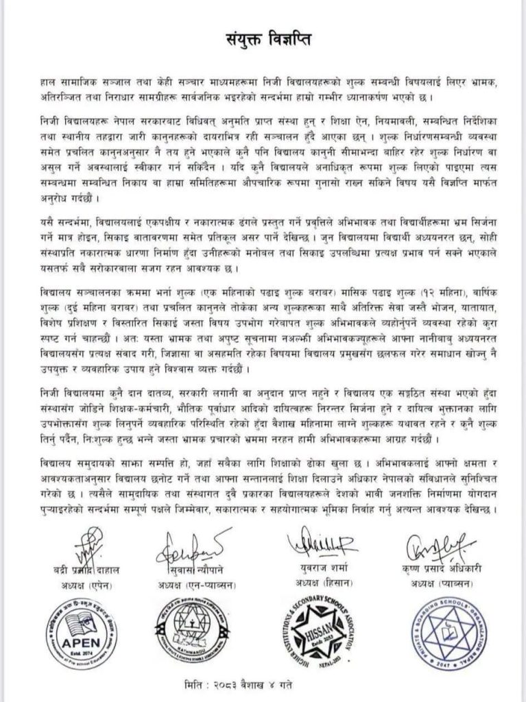 निजी विद्यालय शुल्कबारे संयुक्त विज्ञप्ति: अफवाहमा नपर्न अभिभावकलाई आग्रह