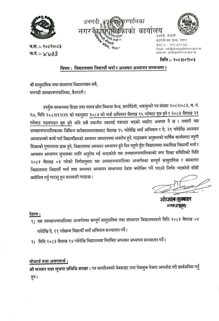 शिक्षा तथा मानव स्रोत विकास केन्द्रले पठाएको पत्रअनुसार देशभर शैक्षिक सत्र २०८३ को विद्यार्थी भर्ना अभियान वैशाख १५ गतेदेखि सुरु हुने र वैशाख २१ गतेदेखि नियमित पठनपाठन सञ्चालन हुने जानकारी गराइएको थियो। तर स्थानीय सरोकारवालासँगको छलफल तथा नगर शिक्षा समितिको निर्णयअनुसार धनगढी उपमहानगरपालिकाले समयतालिका परिवर्तन गरेको जनाएको छ।