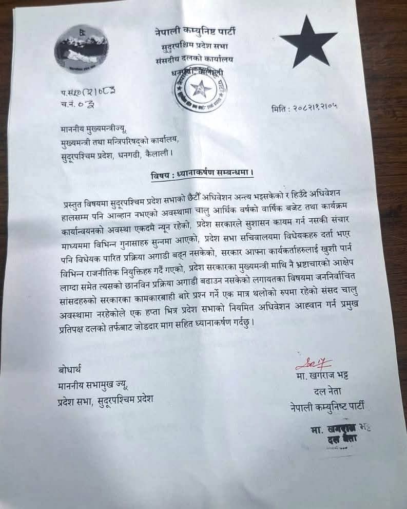पार्टीका प्रदेश सभा संसदीय दलका नेता खगराज भट्टले मुख्यमन्त्री तथा मन्त्रिपरिषद्को कार्यालयलाई पत्र लेख्दै अधिवेशन नहुँदा प्रदेश सरकार सुशासन कायम गर्न असफल भएको बताएका छन्।